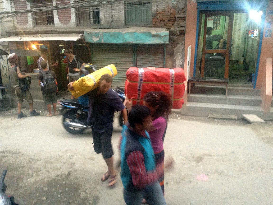 Unser erstes Ziel, die Stadt Devighat, die wir vor drei Tagen bereits besucht hatten. Hier warteten unsere einheimische Kontaktperson Hanuman und zwei grosse Lastwagenladungen mit Nahrungsmitteln bereits auf uns. Dank Hanuman haben wir für die Lebensmittel einen einzigartigen Rabatt bekommen, den man nur aushandeln kann, wenn man mit Einheimischen zusammen arbeitet. Indem wir die Lebensmittel vor Ort und nicht in Kathmandu kaufen, können wir die Händler in der Bergregion unterstützen.