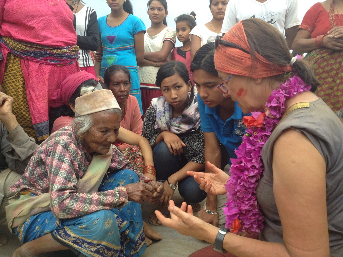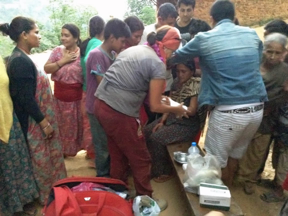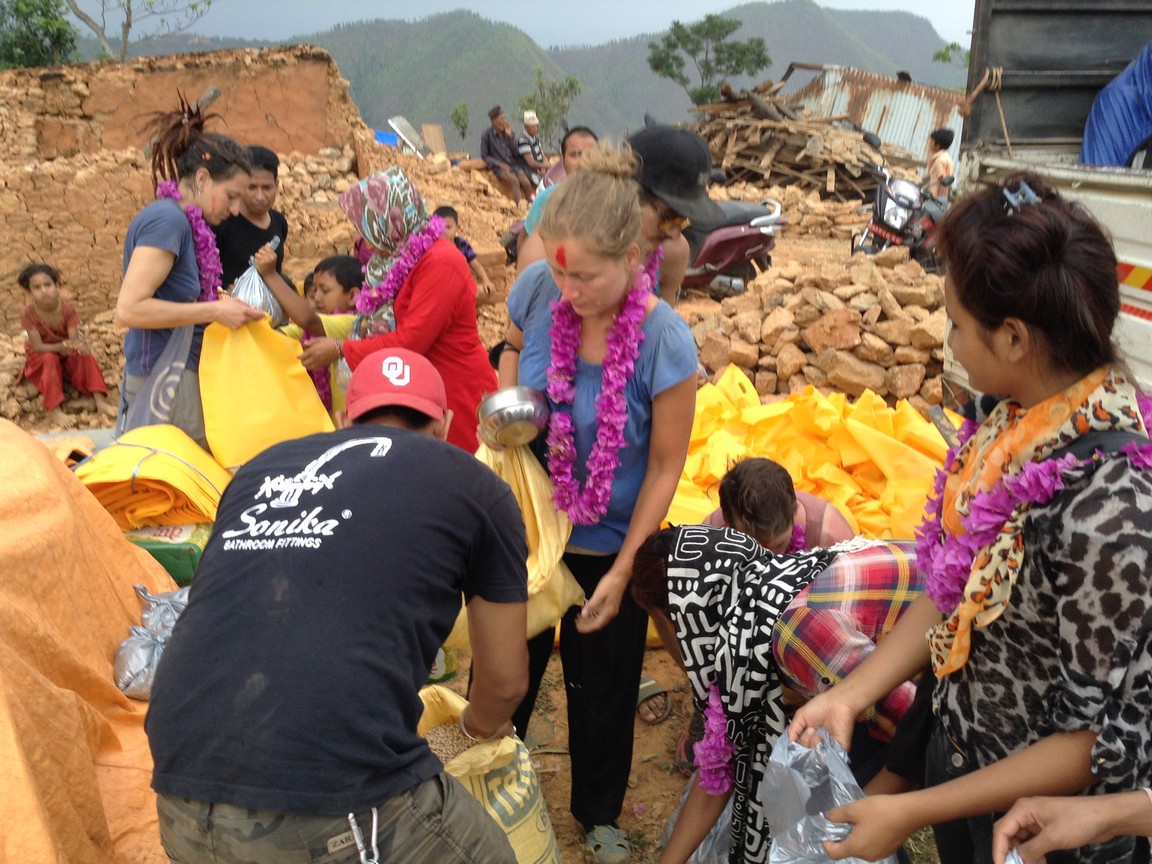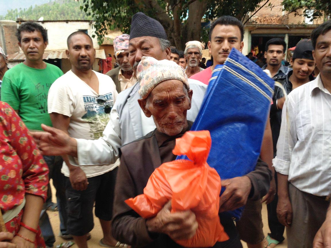 Erster in der Reihe war der Dorfälteste, ein kleiner, faltiger Mann von 91 Jahren, der mit Tränen in den Augen die ersten Güter entgegennahm. Ein Trupp des nepalesischen Militärs stand um uns herum, bewunderte unsere Aktion und die Soldaten nahmen Fotos von uns auf. Björn fragte einen Soldaten, wo denn die Hilfe der nepalesischen Regierung bliebe. Der Soldat meinte bedauernd, dass es auch ihn betrübt, all das Elend zu sehen ohne dass Hilfe seitens der Regierung hierher gelangt. Sie wurden aus verschiedenen Teilen Nepals lediglich hierher stationiert, um "für Ordnung zu sorgen". Einfluss darauf, dass humanitäre Hilfe geleistet wird, haben sie jedoch nicht.