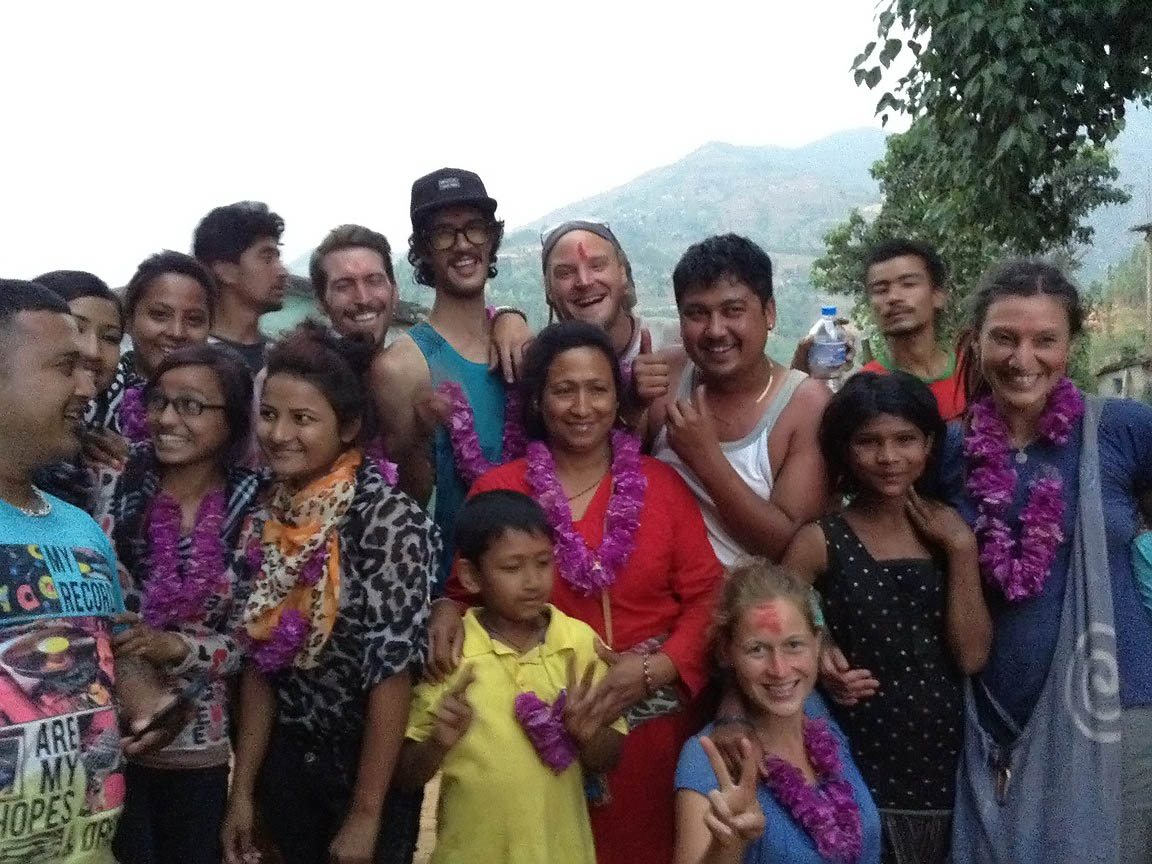 In Devighat wartete zudem ein spanisches Filmteam auf uns, welches unsere Hilfsgüteraktion begleiteten wollten. Sie machen einen Dokumentarfilm über die Arbeit freiwilliger Volontäre in Nepal und unsere Arbeit wird Teil der Dokumentation sein. Am Vormittag hatten sie bereits Zeit in das betroffene Dorf zu fahren und Bildmaterial aufzunehmen. Nun folgten weitere Interviews mit Hanuman und Björn zu der Hilfsaktion und über unsere weiteren Vorhaben. Gegen 14 Uhr waren wir dann endlich soweit, uns auf den Weg in die Berge zu machen. Unser Team von sechs Helfern, Hanuman und vielen weiteren Einheimischen machte sich auf den Weg, entweder auf der Ladung der Trucks oder auf Motorrädern nebenher. Der Schotterweg nach Alam Dala 6 war dieses Mal nicht so lang, wie nach Dhadakharka, unserem letzten Ziel, doch mindestens genauso steil und unwegsam. Zudem zogen bereits am frühen Nachmittag Regenwolken über den Bergen herauf. Wenn es zu regnen angefangen hätte, wäre es unmöglich gewesen, mit den Trucks weiter zu fahren, geschweige denn nach der Aktion wieder zurück an unseren Basisort Devighat zu gelangen. Es war ein Wettlauf gegen die Zeit. Die dunkle Wolkenwand über den Bergen drohte uns einen Strich durch die Rechnung zu machen. Wir riskierten die Weiterfahrt die steilen Serpentinen herauf und ohne weitere grossen Hindernisse gelangten wir nach Alam Dala 6.