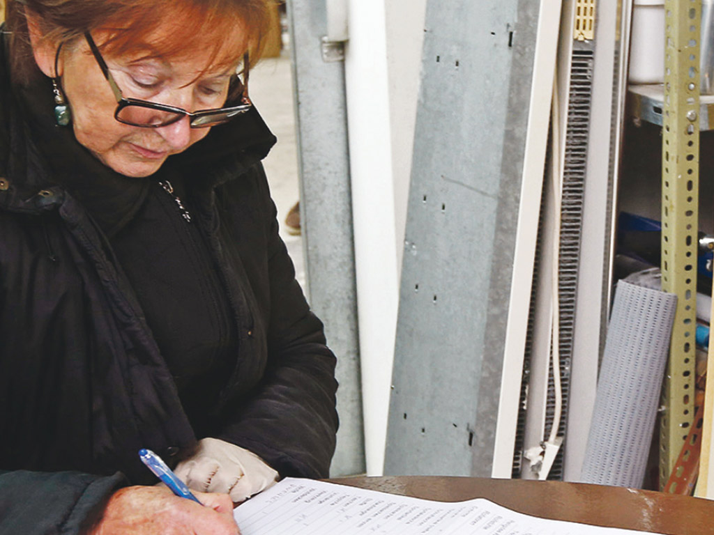 Sie steht vor einem Tisch, auf dem fünf große Bananenschachteln liegen. Auf jeder steht akkurat in großen Lettern geschrieben, was hineinkommt: „Baby“, „Kinder von 6 bis 9 Jahren“, „Frauen“, „Kuscheltiere“, „Männerjacken“. Daneben liegen in großen Stapeln die vorsortierten, sauberen Kleidungsstücke und Stofftiere, die jetzt nur noch verpackt gehören. Die Schachteln werden systematisch befüllt, verschlossen, mit Klebestreifen versandfertig gemacht und an der gegenüberliegenden Wand aufgestapelt