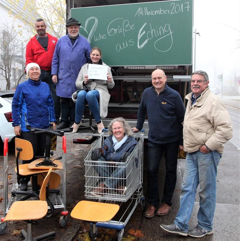 Ausgangspunkt Schulkeller: Ein großer Lagerraum unter der Turnhalle der Grund- und Mittelschule an der Danziger Straße war bis in den letzten Winkel vollgestellt mit ausrangiertem, gut erhaltenem Schulmobiliar, das dort viel Platz wegnahm und nutzlos vor sich hin staubte. Den Möbeln fehlt funktional und optisch nichts. Sie mussten aber ausgemustert werden, weil sie nach DIN-Norm nicht mehr der aktuell gültigen Klassenzimmerausstattung deutscher Schulen entsprechen. Doch dank einiger glücklicher Zufälle, spontaner Hilfsbereitschaft und Organisationstalent heisst es nun anstelle von Verschwendung sinnvolle Verwendung. Eine ganze Lkw-Ladung mit insgesamt 146 Schülerstühlen, 58 Schülerpulten, einer großen mobilen Kreidetafel sowie einigen Sitzbänken, Drehhockern und -stühlen geht ins rumänische Resita. Dort wird eine ganze Schule mit der Sachspende aus Eching ausgestattet.